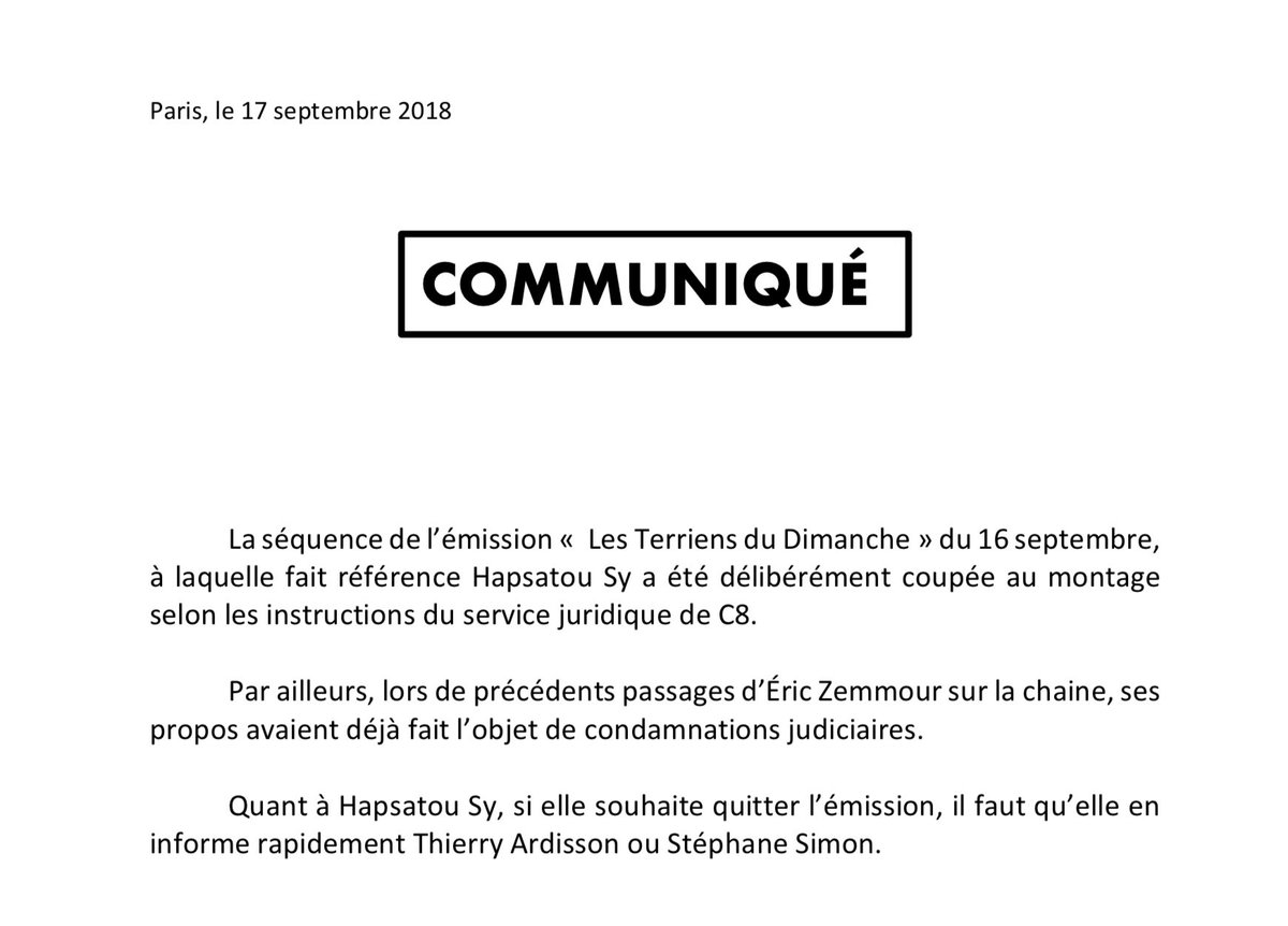 Je comprends l’émotion d’Hapsatou. Je suis très désolé de cette histoire. Maintenant, Hapsatou, elle a été appelée à peu près 50 fois pendant le week-end par le patron de C8, Franck Appietto, elle a été appelée par mon co-producteur Stéphane Simon, et elle n’a pas décroché son téléphone pendant le week-end. Donc je fait que je l’appelle ou pas n’a rien à voir dans l’affaire. Ce n’est pas personnel cette histoire. C’est une collaboratrice de mon émission, je n’ai aucune relation personnelle avec elle. Elle ne répond pas, et au contraire, elle s’étale sur Twitter, pour faire un « bad buzz » qui est complètement nul ! Je ne suis pas très heureux parce qu’en plus elle a un devoir de réserve. Elle a un contrat qui précise que tout ce qui se passe doit être confidentiel. Elle a signé ce contrat. […] Ce qui prouve notre bonne volonté, c’est que, comme elle a des problèmes d’argent, on lui a avancé 6 émissions. On est tellement méchant que quand quelqu’un nous dit « j’arrive pas à payer mes impôts » on lui avance 6 émissions ! Je ne connais pas beaucoup de productions qui font cela à Paris aujourd’hui. Après si elle ne veut pas revenir, elle ne revient pas. On lui a envoyé un courrier ce matin en lui demandant si elle revenait ou pas. Parce que nous, il faut qu’on prépare l’émission, qu’on tourne jeudi soir. C’est très malheureux, je suis très désolé de cette histoire… Franchement, les débats avec Zemmour étaient de hauts niveaux. […] Si elle revient dans un bon esprit, je souhaite qu’elle revienne. Mais si elle revient pour me faire des scènes tous les jeudis, je ne souhaite pas qu’elle revienne c’est clair !